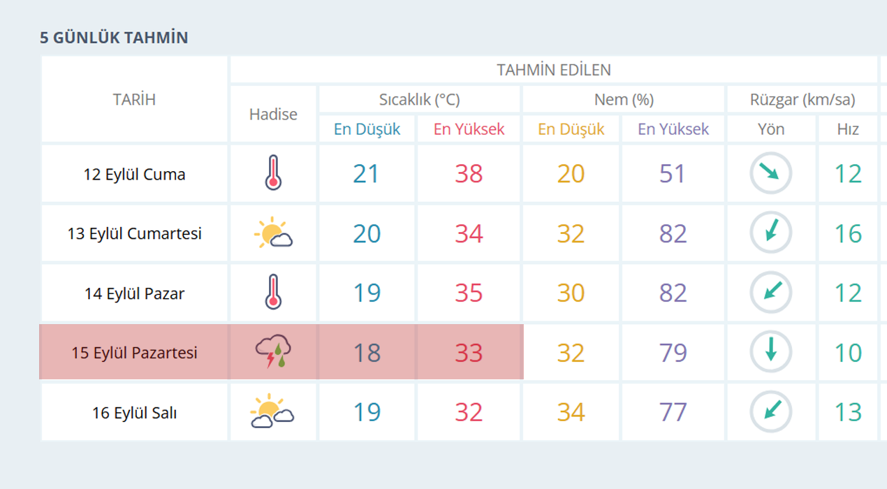 15 Eylül Pazartesi günü ise kent genelinde gök gürültülü sağanak yağış bekleniyor.