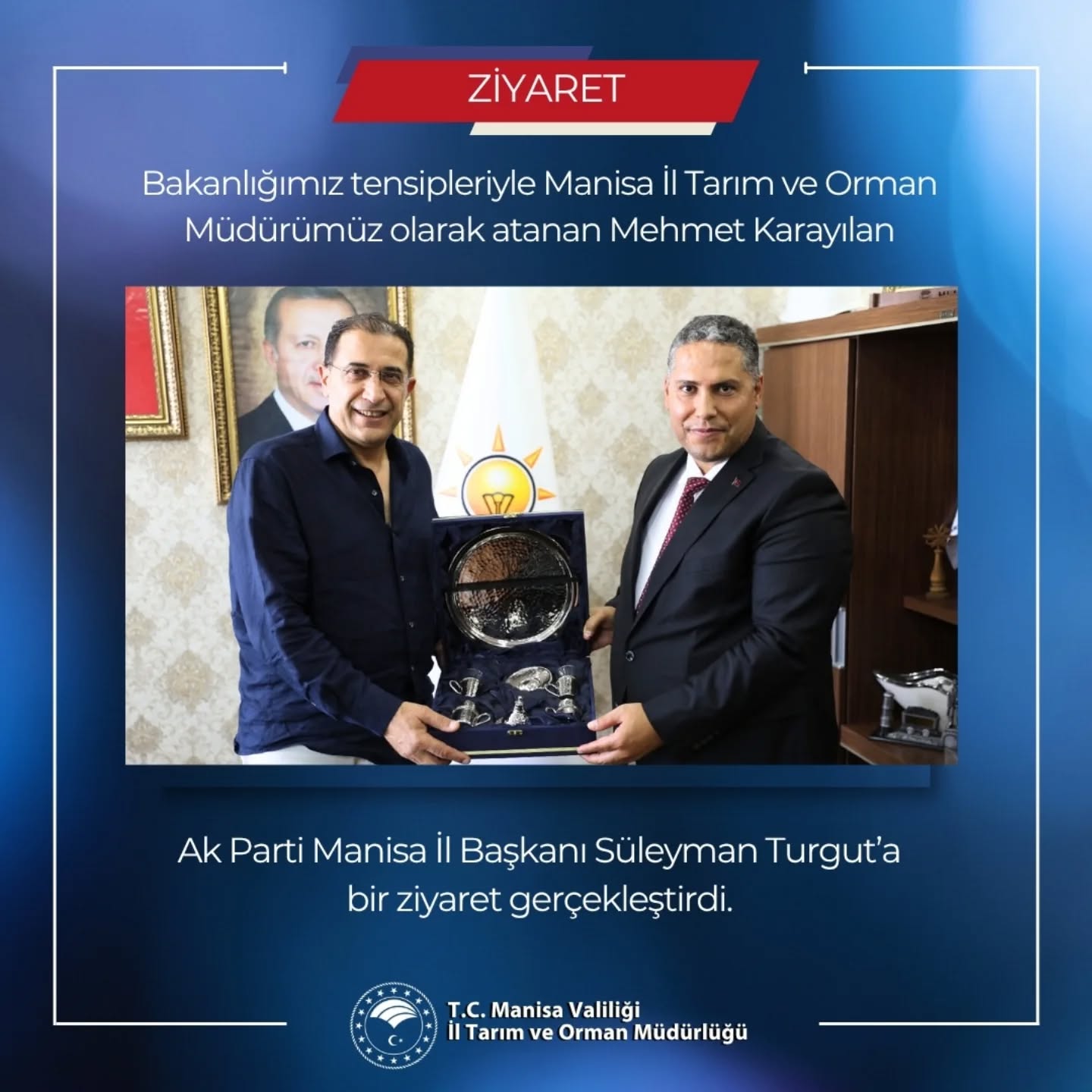 Manisa İl Tarım ve Orman Müdürlüğü görevine atanan Mehmet Karayılan, kentteki protokol ziyaretleri kapsamında AK Parti Manisa İl Başkanı Süleyman Turgut’u makamında ziyaret etti.
