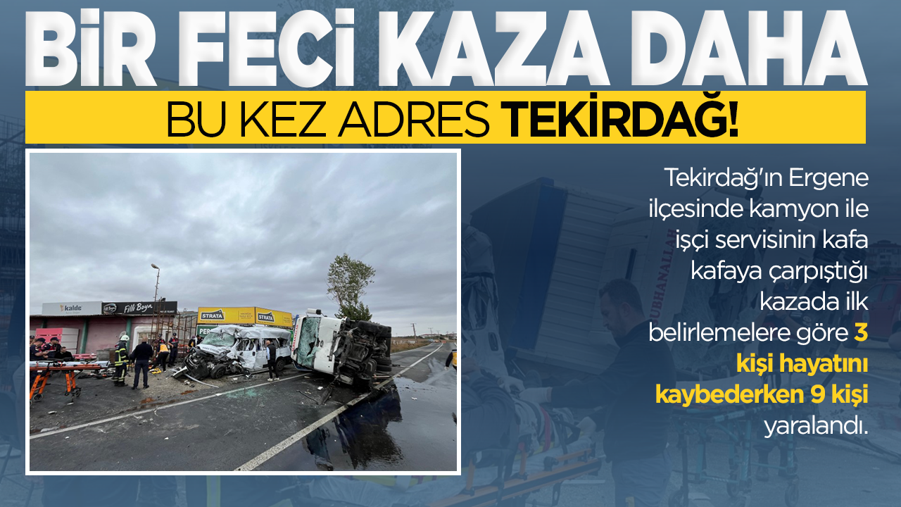 Tekirdağ'ın Ergene ilçesi Velimeşe Mahallesi'nde işçi servisi ile kamyonun kafa kafaya çarpışması sonucu ilk belirlemelere göre 3 kişi hayatını kaybederken 9 kişi yaralandı.