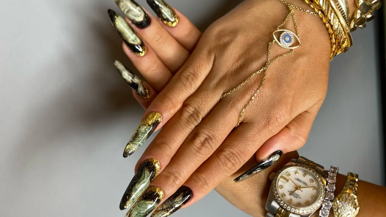 Burcu Gürel’in dolar temalı tırnak tasarımı yalnızca estetik bir tercih değil, aynı zamanda güçlü bir manifestin ürünü. Kendi deyimiyle, "Bir şeyin olmasını çok istediğimde içimden geçirip bir işaret, bir totem yaparım." diyor. Burcu Gürel’in seçtiği sembol ise 1 Amerikan doları oldu. Gerçek dolar banknotlarını keserek hazırladığı bu özel tasarımı bir tür kişisel totem, bir manifest aracı olarak kullandı.