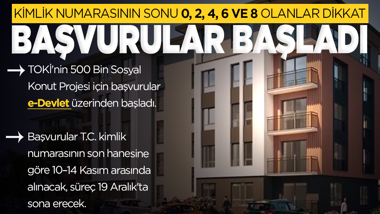 Toplu Konut İdaresi Başkanlığı (TOKİ) tarafından hayata geçirilen 500 Bin Sosyal Konut Projesi için başvurular başladı. Dar ve orta gelirli vatandaşların uygun fiyat ve esnek ödeme seçenekleriyle ev sahibi olabileceği kampanyaya başvurular, 10 Kasım 2025 Pazartesi günü saat 09.00'da e-Devlet üzerinden alınıyor.