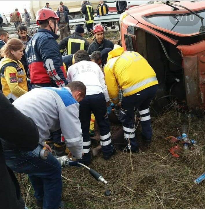 Meydana gelen kaza sonrası kamyon sürücüsü A.K(50) direksiyon mahalinde sıkıştı.