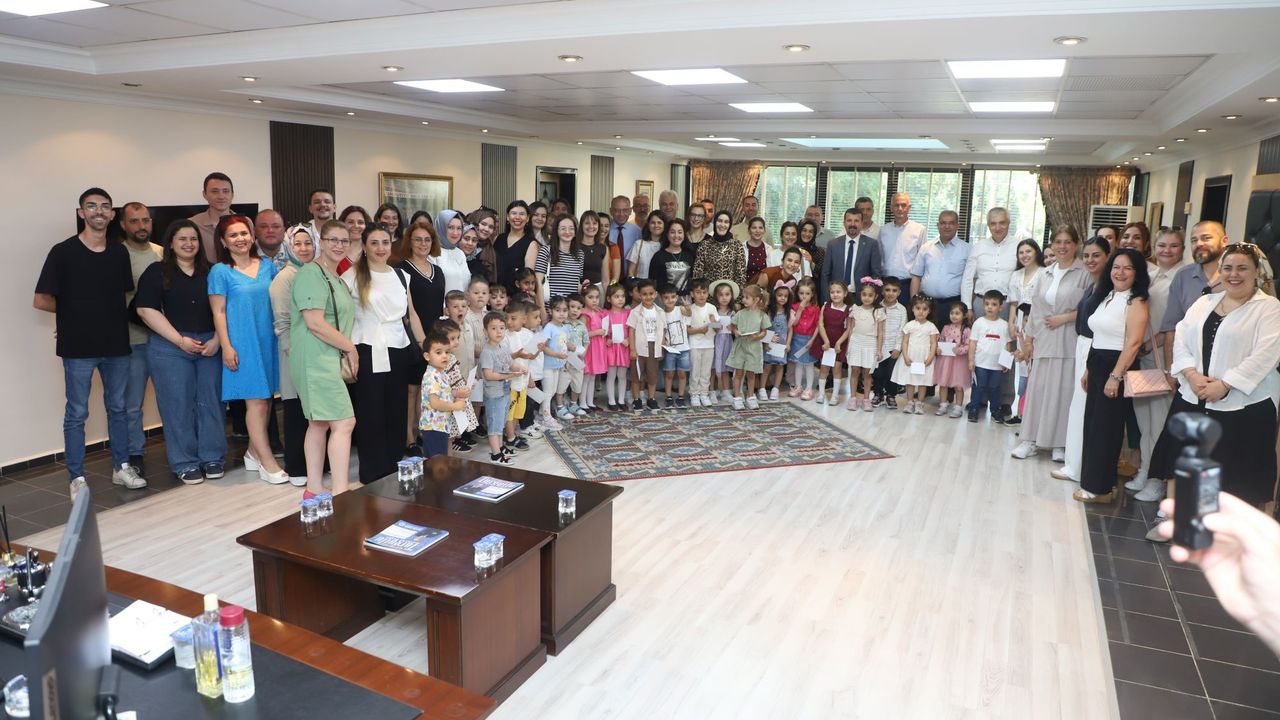 Albayrak ve Mustafa Kemal Mahallelerinde hizmet veren ve sunduğu imkanlarla Türkiye’de ilke imza atılan Çocuk Kültür Sanat Merkezi öğrencileri Başkan Çetin Akın’ı makamında ziyaret ederek bayramını kutladı.