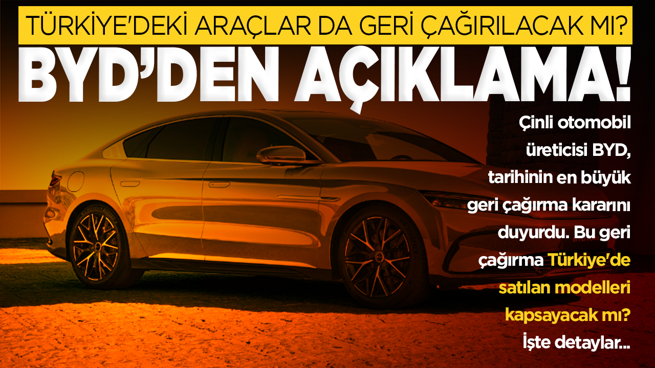 Çinli otomobil devi BYD'nin, tarihinin en büyük geri çağırma kararını duyurmasının ardından BYD Türkiye'den konuya ilişkin açıklama geldi. Şirket, söz konusu geri çağırmanın Türkiye'de satılan modellerle ilgisi olmadığını vurguladı.BYD Türkiye açıklamasında, "Bugün bazı mecralarda yer alan haberler üzerine kamuoyunu bilgilendirme gereği duyulmuştur. Birçok üreticide olduğu gibi BYD'de de araçlarını sürekli iyileştirme ve kullanıcı deneyimini en üst seviyeye taşımak amacıyla zaman zaman geri çağırma kampanyaları düzenlenmektedir. Satılan bir aracın herhangi bir arıza çıkarmadan sorunsuzca kullanılabilmesi BYD'nin üretim felsefesidir. Söz konusu geri çağırma, yalnızca Çin iç pazarında satılan 2015–2022 yılları arasında üretilen bazı Tang hibrit serisi ile Yuan Pro modellerini kapsamaktadır. BYD'nin Çin'de duyurduğu söz konusu geri çağırma kampanyası, Türkiye'de satılan hiçbir modeli kapsamamaktadır." denildi.