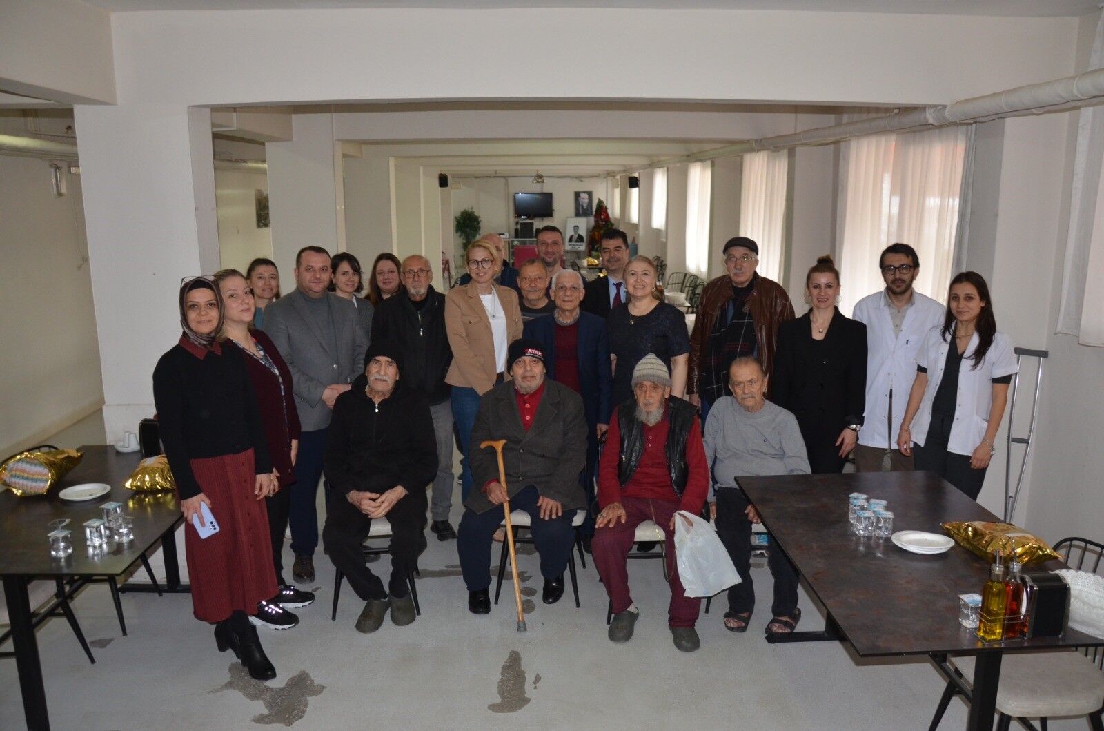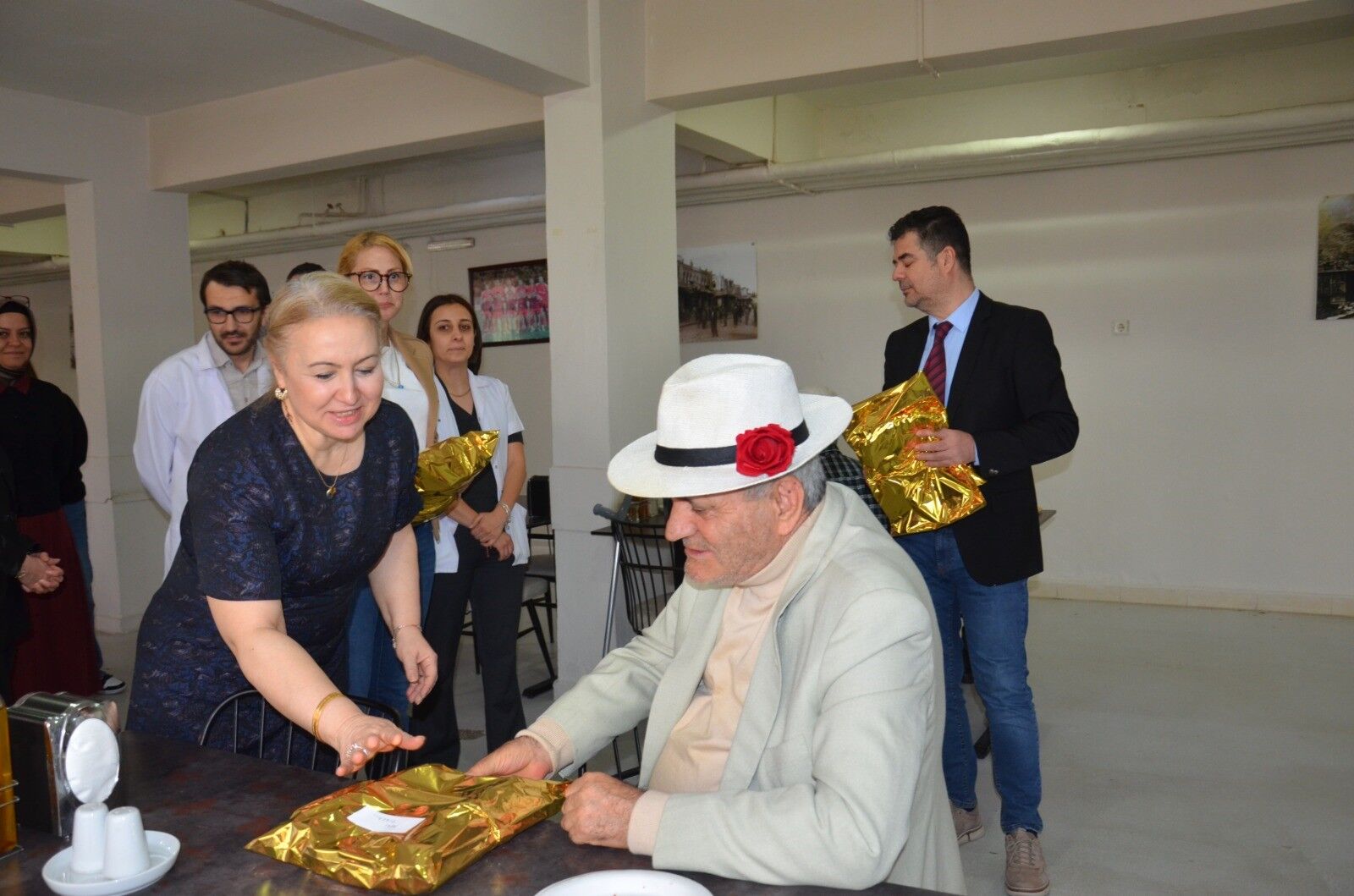 Başhekim Uzm. Dr. Fatma Nesim Yağlı, projeye destek veren doktorlarla birlikte huzurevine giderek görevlilerin eşliğinde kadın bölümündeki yaşlıları odalarında ziyaret etti ve hediyelerini takdim etti. Daha sonra huzurevi yemekhanesinde erkek yaşlılarla bir araya gelen doktorlar, Yaşlılar Haftası'nı kutlayarak el emeği hediyeleri dağıttı.