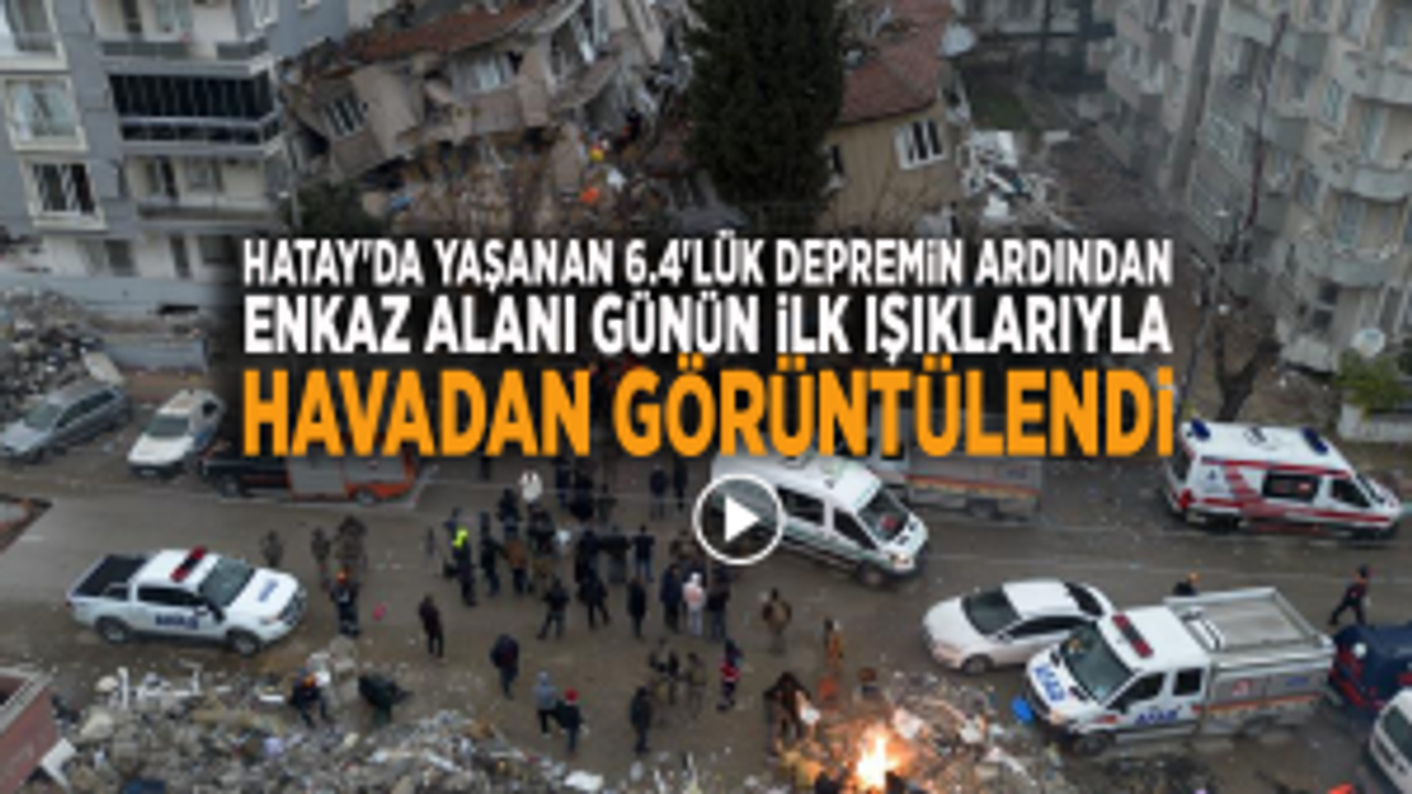 Hatay'da yaşanan 6.4'lük depremin ardından enkaz alanı günün ilk ışıklarıyla havadan görüntülendi