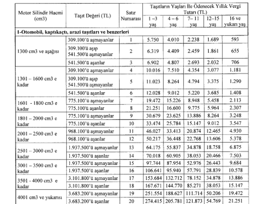 Bu tutar 1601-1800 cc arası yeni araçlarda 21 bin 251 lira,, 1801-2000 cc arası yeni araçlarda ise 33 bin 474 lira olacak.