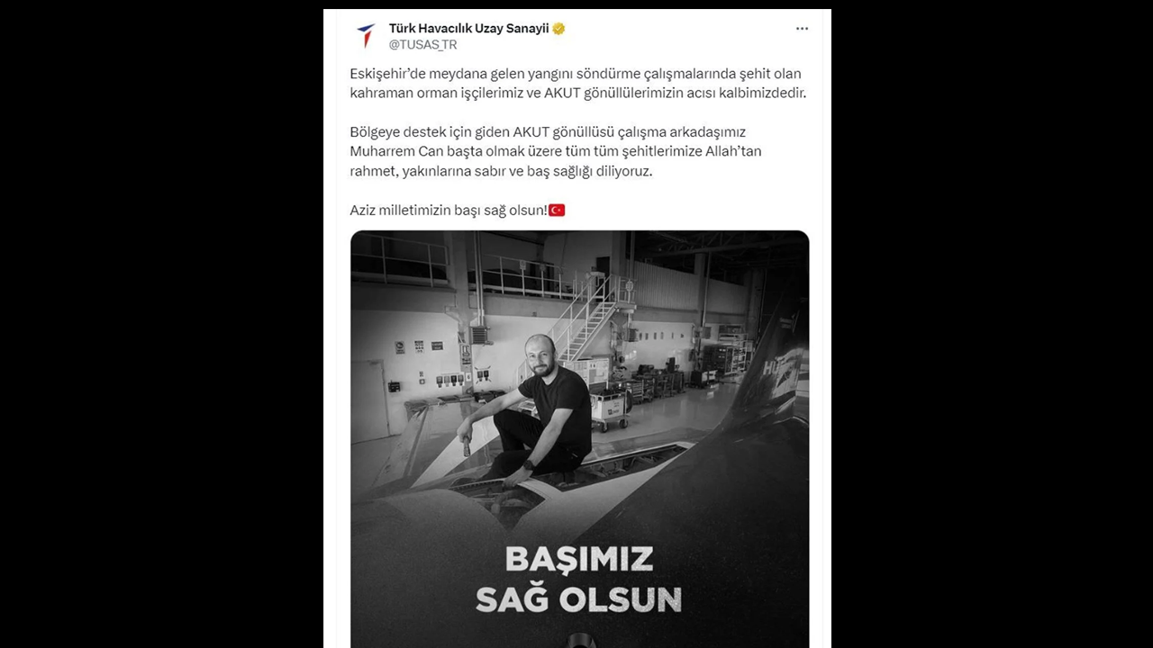 TUSAŞ, orman yangında şehit olanlar için sosyal medya hesabından taziye mesajı yayımladı.