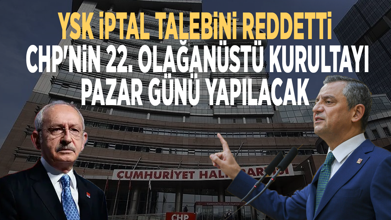 CHP'nin 21 Eylül'de yapılacak 22. Olağanüstü Kurultayı'nın iptali talebiyle ilgili ilçe seçim kurulunun ret kararı vermesi, il seçim kurulunun "karar verilmesine yer olmadığına" hükmetmesi üzerine başvuru "tam kanunsuzluk" iddiasıyla Yüksek Seçim Kurulu'na taşındı. Kurul, iptal talebini reddetti.