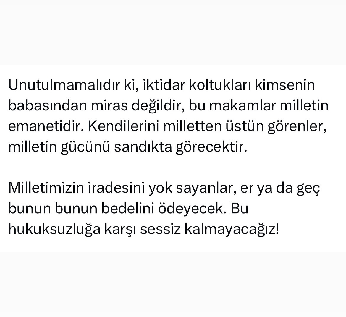 Milletimizin iradesini yok sayanlar, er ya da geç bunun bedelini ödeyecek. Bu hukuksuzluğa karşı sessiz kalmayacağız!"