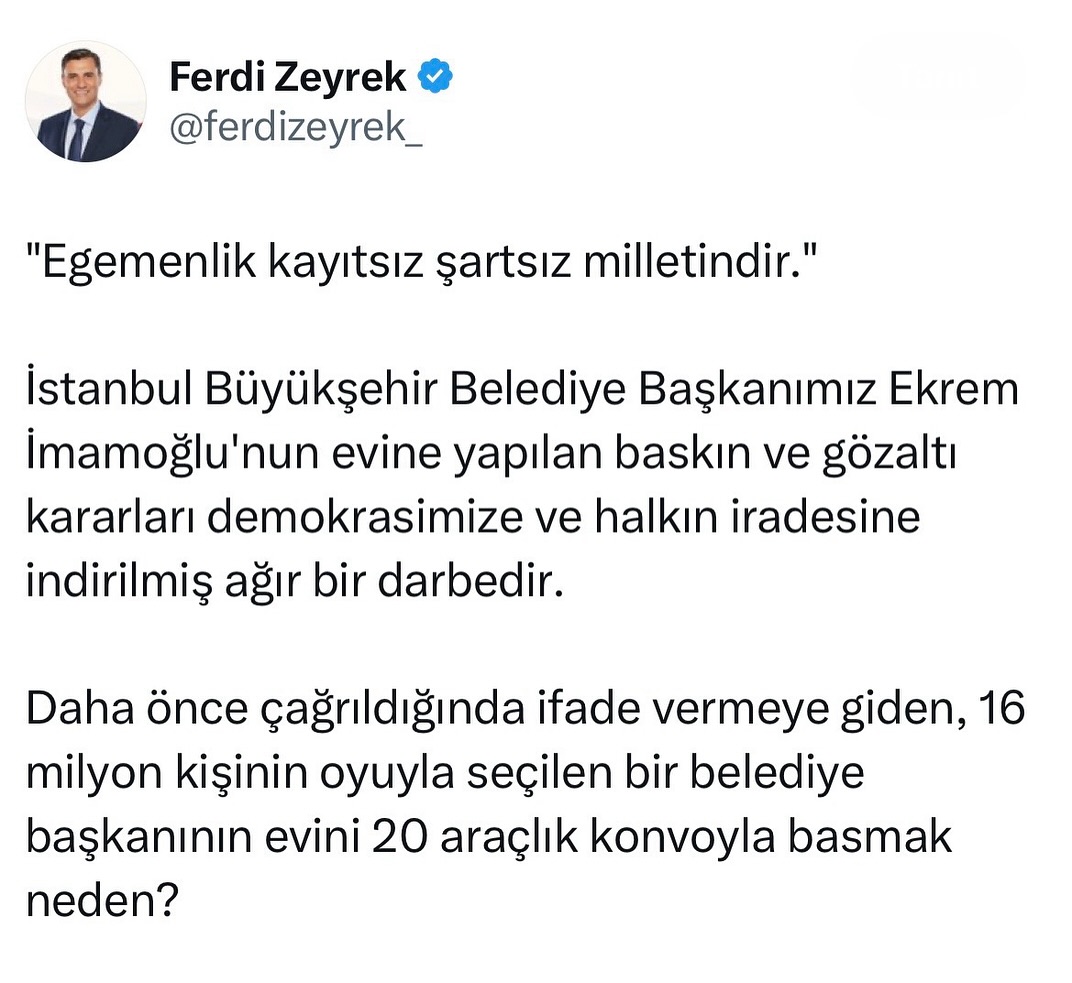 "İstanbul büyükşehir belediye başkanımız Ekrem İmamoğlu'nun evinde yapılan baskın ve gözaltı kararları demokrasimize ve halkın iradesine indirilmiş ağır bir darbedir. Daha önce çağrıldığında ifade vermeye giden 16 milyon kişinin oyuyla seçilen bir belediye başkanının evini 20 araçlı konvoyla basmak neden?